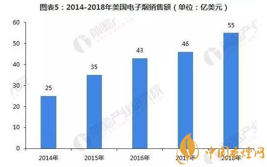 根據(jù)《2017年世界煙草發(fā)展報(bào)告》顯示,北美是第一大電子煙市場(chǎng),而跟據(jù)貝倫貝格銀行發(fā)表的一份報(bào)告稱,美國已經(jīng)成為世界上新一代產(chǎn)品銷量最大的市場(chǎng)。2014-2017年,美國電子煙銷售額逐年增長(zhǎng),2017年增長(zhǎng)至46億美元。而2017年全球電子煙銷售額約為100億美元,美國就占了近50%的市場(chǎng)份額。預(yù)計(jì)2018年美國電子煙銷售額將達(dá)到55億美元。
