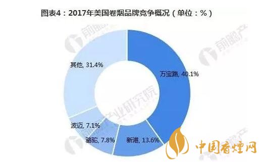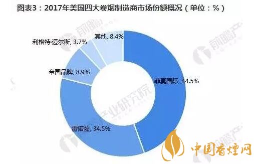 目前,美國市場(chǎng)上主要有四家大的卷煙制造商:菲莫國際、雷諾茲煙草公司、帝國品牌公司以及利格特邁爾斯煙草公司。2017年,菲莫國際在美國的市場(chǎng)份額為44.5%,較上年下降了2.1個(gè)百分點(diǎn);雷諾茲煙草公司的市場(chǎng)份額為34.5%,同比上升0.8個(gè)百分點(diǎn);帝國品牌公司市場(chǎng)份額增長(zhǎng)了0.1個(gè)百分點(diǎn),至8.9%;利格特邁爾斯煙草公司的市場(chǎng)份額增加了0.1個(gè)百分點(diǎn),至3.7%。