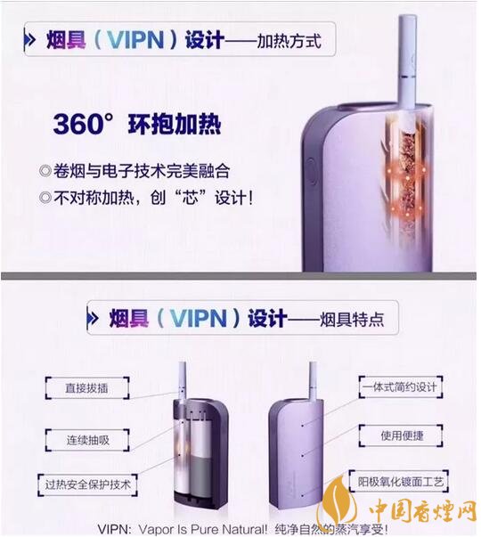 看到海報(bào)圖片上面介紹說(shuō),煙具VIPN為360度環(huán)抱加熱,具有直接拔插、連續(xù)抽吸、過(guò)熱安全保護(hù)技術(shù)等特點(diǎn)。