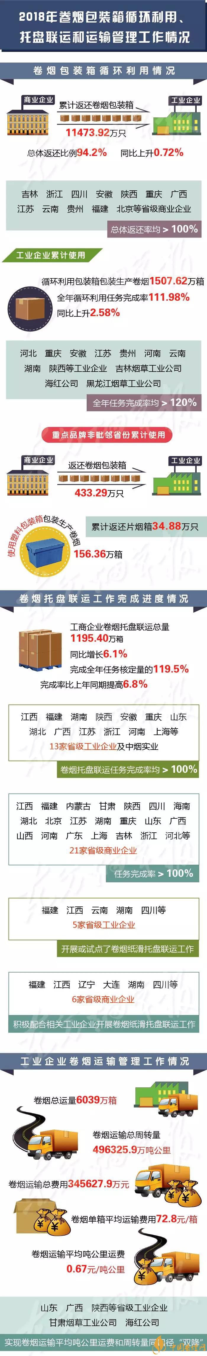 1月29日,國家煙草專賣局通報了2018年度卷煙包裝箱循環(huán)利用、卷煙托盤聯(lián)運及卷煙運輸管理工作情況(一圖速覽↓↓↓)。