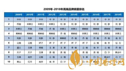 到2018年,「中華」銷量穩(wěn)定在135萬箱以上,市場份額保持在42%以上,「利群」以35萬箱銷量位居第2位,「黃鶴樓」接近25萬箱,「芙蓉王」、「南京」和「鉆石」突破10萬箱。和2009年相比,10萬箱以上品牌從3個增加到7個,5萬箱以上從1個增加到7個,萬箱以上品牌達到11個,市場的成長性與品牌的爆發(fā)力形成了線性的相得益彰。