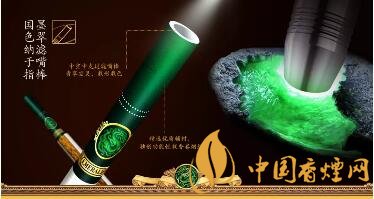 取出煙支,碧玉通透,上有祥云狀龍騰圖標(biāo)和金色翡翠字樣,近煙端為金色“EMERALD”字母和回形紋環(huán)繞,輔之于中空中支過濾嘴棒及獨創(chuàng)功能性載香卷煙紙,集外觀與功能于一身。