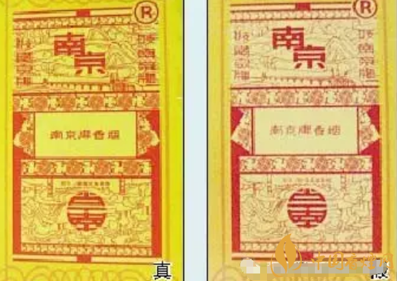 真煙條盒側(cè)面、小盒底部的老南京注冊(cè)商標(biāo)圖案,紅色以外的底色部分發(fā)黃;假煙的老南京注冊(cè)商標(biāo)圖案發(fā)白,圖案模糊。#p#副標(biāo)題#e#