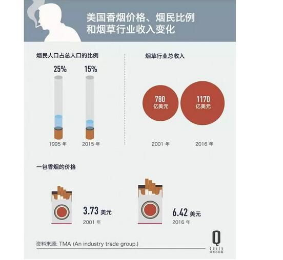 根據(jù)市場調(diào)研公司的報告,2001 年至 2016 年期間,美國香煙的銷售數(shù)量減少了 37%,與此同時,美國吸煙人口的比例也下降了,但煙草公司的利潤卻上升了。在2016 年,美國煙草行業(yè)的利潤達到了 184 億美元。(跟我國一比這好像都不算什么了)