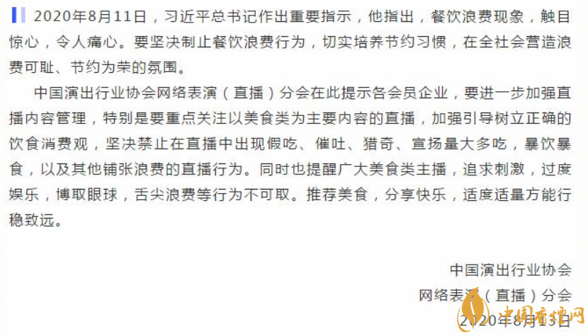 據(jù)中國演出行業(yè)協(xié)會官方微信消息,中國演出行業(yè)協(xié)會網(wǎng)絡表演 ( 直播 ) 分會在此提示各會員企業(yè),要進一步加強直播內(nèi)容管理,特別是要重點關(guān)注以美食類為主要內(nèi)容的直播,加強引導樹立正確的飲食消費觀,堅決禁止在直播中出現(xiàn)假吃、催吐、獵奇、宣揚量大多吃,暴飲暴食,以及其他鋪張浪費的直播行為。同時也提醒廣大美食類主播,追求刺激,過度娛樂,博取眼球,舌尖浪費等行為不可取。推薦美食,分享快樂,適度適量方能行穩(wěn)致遠。