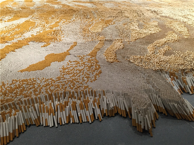 這件巨大而厚實的“虎皮地毯”鋪陳,是由50萬支重達440磅的香煙按照特殊的排列組成的驚人之作。為了突出全球貿(mào)易、包裝和人們是如何被致命的吸煙習(xí)慣所誘惑,56歲的徐冰經(jīng)過十年探索花上十年的時間去制作……,最終創(chuàng)作出此作品。