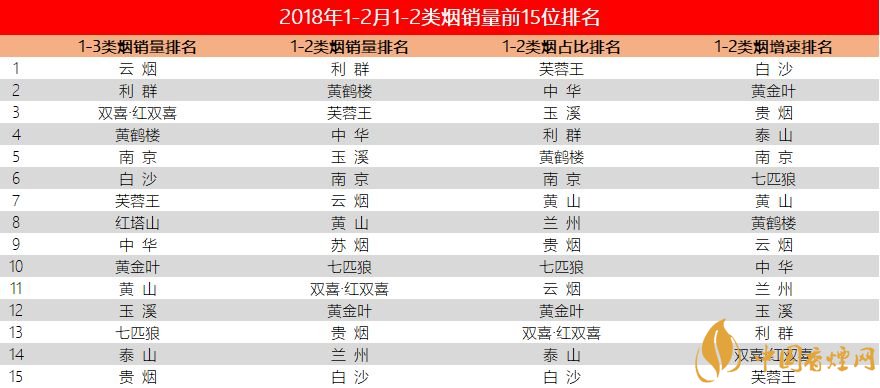 表二:2018年前兩月1-2類煙銷量前15位排名