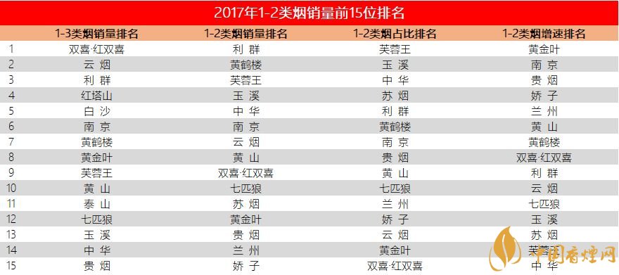 表一:2017年1-2類煙銷量前15位排名