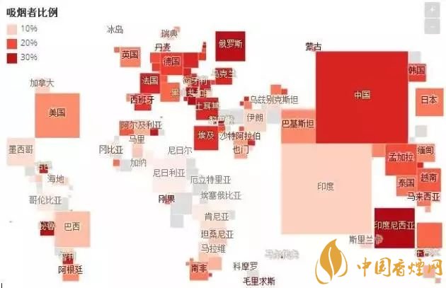 2016年,該國(guó)每天的煙草消費(fèi)者即吸煙者占15周歲以上人口的百分比。各國(guó)均被標(biāo)識(shí)為正方形,并可根據(jù)人口基數(shù)進(jìn)行縮放,以便您更直觀地了解各國(guó)吸煙人數(shù)。