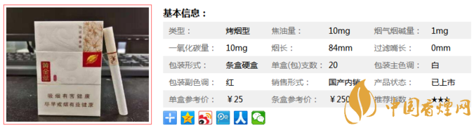 | 類型 :烤煙型 | 焦油量 :10mg | 煙氣煙堿量 :1mg | 一氧化碳量 :10mg |