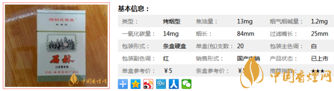 石林白香煙煙長(zhǎng)84mm,過(guò)濾嘴長(zhǎng)25mm,采用高難度的凸、平燙結(jié)合的燙金技術(shù);多工序膠凹印相結(jié)合,增加了商標(biāo)的制作難度;采用了具有較強(qiáng)防偽功能的潛影壓紋新技術(shù),從不同方向看,可見(jiàn)“石林”和“STONE FOREST”英文。下面我們一起來(lái)看石林白的參數(shù)信息:焦油量:13mg 煙堿量:1.2mg 一氧化碳量:14mg.