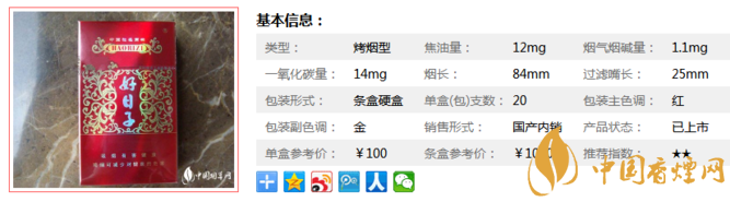 | 類型 :烤煙型 | 焦油量 :12mg | 煙氣煙堿量 :1.1mg | 一氧化碳量 :14mg |