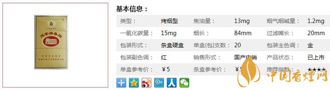 | 類型 :烤煙型 | 焦油量 :13mg | 煙氣煙堿量 :1.2mg | 一氧化碳量 :15mg |