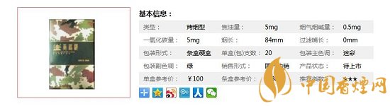 | 類型 :烤煙型 | 焦油量 :5mg | 煙氣煙堿量 :0.5mg | 一氧化碳量 :5mg |