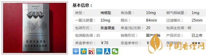 | 煙長:84mm | 過濾嘴長:25mm | 包裝形式:條盒硬盒 | 單盒(包)支數(shù):20 |