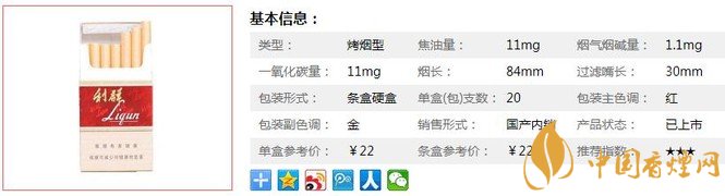 | 類型 :烤煙型 | 焦油量 :11mg | 煙氣煙堿量 :1.1mg | 一氧化碳量 :11mg |