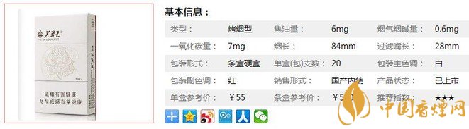 | 類型 :烤煙型 | 焦油量 :6mg | 煙氣煙堿量 :0.6mg | 一氧化碳量 :7mg |