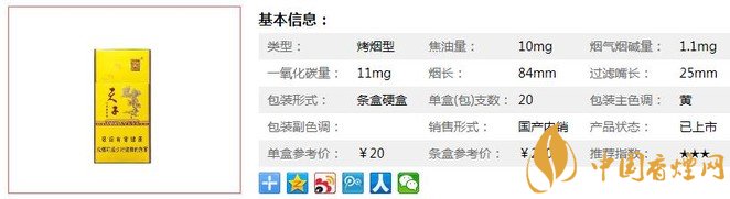 | 類型 :烤煙型 | 焦油量 :10mg | 煙氣煙堿量 :1mg | 一氧化碳量 :10mg |