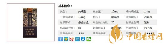 | 類型 :烤煙型 | 焦油量 :10mg | 煙氣煙堿量 :1mg | 一氧化碳量 :10mg |