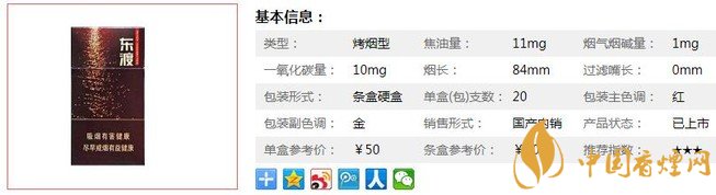| 類型 :烤煙型 | 焦油量 :11mg | 煙氣煙堿量 :1mg | 一氧化碳量 :10mg |