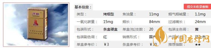| 類(lèi)型 :烤煙型 | 焦油量 :11mg | 煙氣煙堿量 :1.1mg | 一氧化碳量 :15mg |