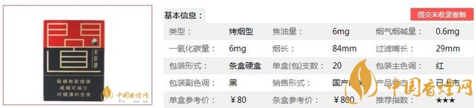 | 類型 :烤煙型 | 焦油量 :6mg | 煙氣煙堿量 :0.6mg | 一氧化碳量 :6mg |