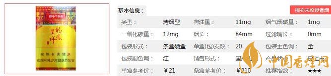 嬌子硬龍鳳珍品煙支長(zhǎng)84mm,過(guò)濾嘴長(zhǎng):24mm,采用高科技材料制造的高級(jí)復(fù)合濾嘴,溝槽嘴棒和復(fù)合式材料結(jié)合,使香氣自然清新。下面我們一起來(lái)看嬌子硬龍鳳珍品的參數(shù)信息:焦油量:11mg 煙堿量:1mg 一氧化碳量:12mg