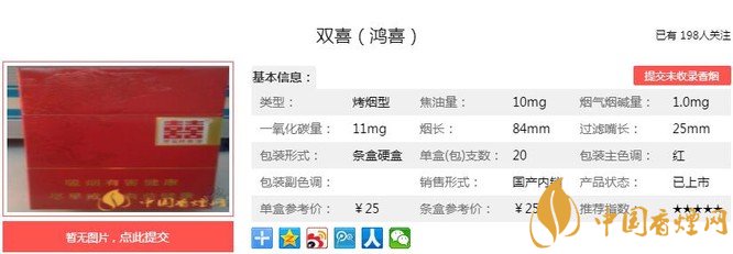 雙喜鴻喜煙支長(zhǎng)84mm,過(guò)濾嘴長(zhǎng):25mm,雙喜鴻喜通過(guò)應(yīng)用上部煙葉使用技術(shù),利用不同產(chǎn)區(qū)、不同部位煙葉的優(yōu)化組合,煙香飽滿醇和。下面我們一起來(lái)看雙喜鴻喜的參數(shù)信息:焦油量:10mg 煙堿量:1.0mg 一氧化碳量:11mg