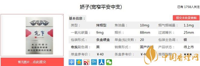 嬌子(寬窄平安中支)煙支長88mm,過濾嘴長25mm,過濾嘴紙張的色澤與煙盒相一致,同為灰色系列。以建筑符號為背景的紙張之上,寬窄與福字,對稱呼應(yīng)。下面我們一起來看嬌子(寬窄平安中支)的參數(shù)信息:焦油量:10mg 煙堿量:1.1mg 一氧化碳量:9mg