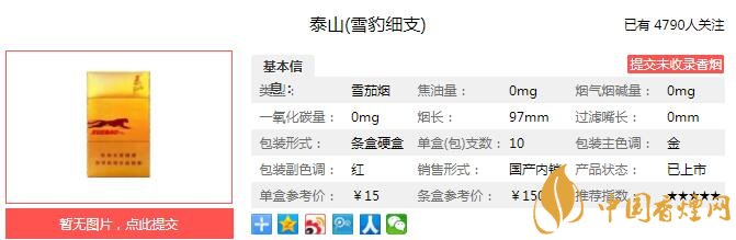 泰山雪豹細(xì)支煙支長(zhǎng)97mm,定位在細(xì)支雪茄煙品類(lèi)。過(guò)濾嘴設(shè)計(jì)很顯檔次,煙身呈現(xiàn)為雪茄色,整體看上去時(shí)尚而典雅。采用獨(dú)特的二元加料技術(shù),將天然的香料與雪茄本香揉合之后,茄香特別的好聞。下面我們一起來(lái)看泰山雪豹細(xì)支的參數(shù)信息:焦油量:中