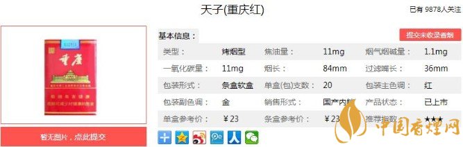 天子(重慶紅)包裝為激光防偽鐳射簽內(nèi)容,與煙盒正面一樣。煙盒頂端除了顏色與中華不同外,設(shè)計(jì)方式很像,尤其是錫紙上的重慶字樣,也與軟中華設(shè)計(jì)有異曲同工之妙。尾端是重慶的漢語(yǔ)拼音字樣,字體樣式與煙盒背面相同。這款重慶紅的整體包裝,酷似軟中華香煙。