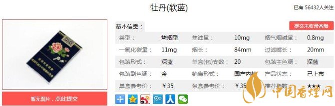 以上便是香煙網(wǎng)小編為大家介紹的關(guān)于清新包裝優(yōu)雅煙香,牡丹軟藍(lán)的價格35元一包!的相關(guān)信息,看完之后大家是不是對于牡丹(軟藍(lán))的相關(guān)信息更加了解呢。大家還想查詢更多的相關(guān)內(nèi)容歡迎點擊:牡丹金細(xì)支多少錢一包 牡丹金細(xì)支口感及參數(shù)介紹