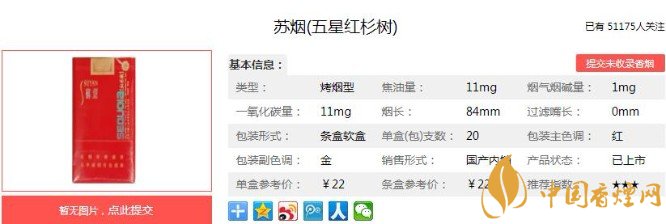 五星紅杉樹降焦線明顯,煙絲濕度較為合適,填充也飽滿,嗅聞煙支有淡淡的蘇系調(diào)香,貌似莫名的果香透著一絲酒香。煙絲緊實(shí),不會(huì)出現(xiàn)掉渣的情況,總體不錯(cuò)。下面便是蘇煙(五星紅杉樹)的基本參數(shù):焦油量:11mg 煙堿量:1.0mg 一氧化碳量:11mg.