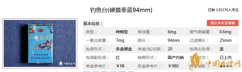 釣魚(yú)臺(tái)(聽(tīng))過(guò)濾嘴內(nèi)添加物可阻斷或抑制煙氣中有害物質(zhì)。煙香醇和舒適,口感津甜圓潤(rùn)。