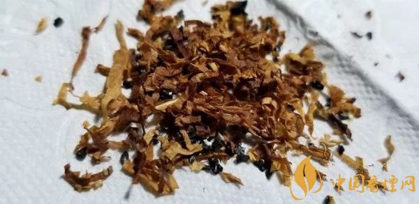 攤開煙絲,外觀金黃油潤。淺黃切寬略寬的為涂布制絲,其余為棕黃的原片煙絲,中間有切得極細(xì)小揉捻得很柔軟的煙梗。用料是比較實在的了。