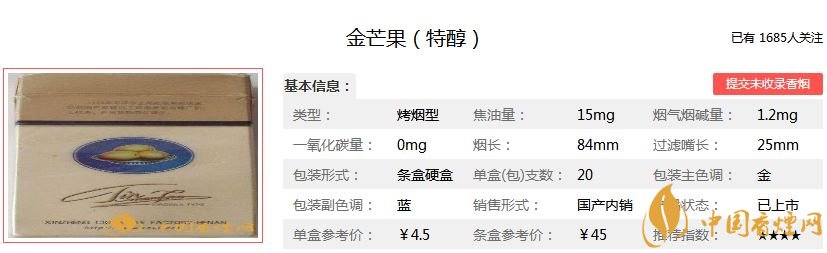 以上就是香煙網(wǎng)為大家整理介紹的金芒果香煙的品牌介紹以及金芒果香煙價(jià)格表圖一覽,希望為大家提供幫助。想查詢更多香煙信息,請(qǐng)關(guān)注香煙網(wǎng)!