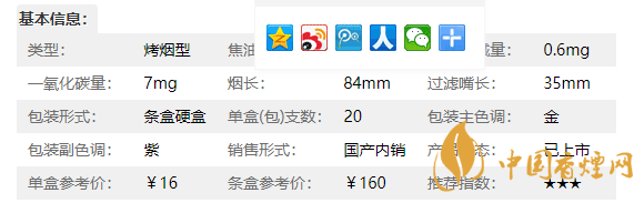 | 類型 :烤煙型 | 焦油量 :6mg | 煙氣煙堿量 :0.6mg | 一氧化碳量 :7mg |