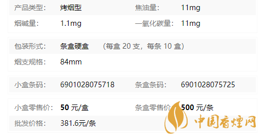 | 類型 :烤煙型 | 焦油量 :11mg | 煙氣煙堿量 :1.1mg | 一氧化碳量 :11mg |
