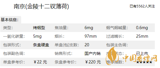 南京金陵十二釵薄荷煙核心參數(shù)