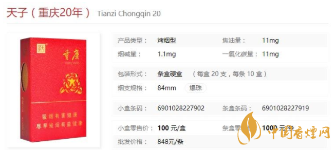 重慶天子20年采用津巴布韋優(yōu)質(zhì)煙葉和武陵生態(tài)煙葉,手工精選頂級(jí)煙葉。下面一起來看下天子重慶20年的具體參數(shù):一盒20支,煙長(zhǎng)84mm,焦油量11mg,煙堿量1.1mg,一氧化碳量11mg。