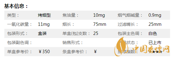 | 類型 :烤煙型 | 焦油量 :11mg | 煙氣煙堿量 :1mg | 一氧化碳量 :13mg |