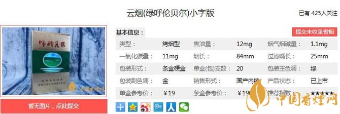 云煙綠呼倫貝爾小字版煙支長84mm,過濾嘴長25mm,過濾嘴的整體樣式,也與云煙版的相同,但長度要短于后者。卷紙潔白,煙絲充滿彈性。散發(fā)誘人的醇香,是歷史的積淀和厚重,是煙絲歷史時(shí)間洗禮后,破蠶成蝶般地成熟與穩(wěn)重。下面我們一起來看云煙綠呼倫貝爾小字版的參數(shù)信息:焦油量:12mg 煙堿量:1.1mg 一氧化碳量:11mg