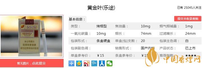 研發(fā)樂途時(shí)在原料上精中選精、在配方上優(yōu)中選優(yōu)、在工藝上量身定制,傾注了大量心血。煙支變短,工藝不短;煙支變短,韻味更長(zhǎng)。煙氣飽滿,煙草本香濃郁,很受消費(fèi)者的喜歡。經(jīng)香煙網(wǎng)小編市場(chǎng)調(diào)查黃金葉樂途售價(jià)為15元/包。