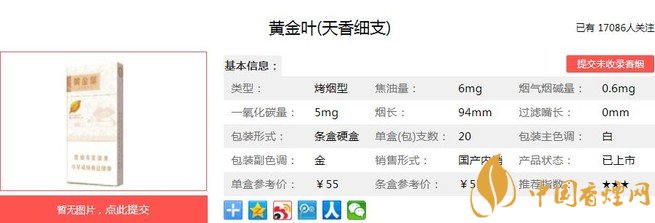 黃金葉天香細支類別為“高一類A(細支)潛力規(guī)格”,烤煙類型。外包裝沿襲天葉低調奢華的品系風格,一如既往的黃金標準,一絲不茍的手捻精神,和大小天葉系列一脈相承,據(jù)香煙網(wǎng)小編市場調查它的零售參考價為55元/包。