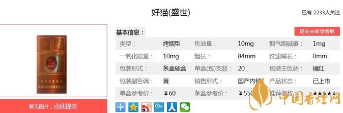 好貓盛世以高香低危害為主要設(shè)計(jì)方向,主要原料精心選用自然醇化兩年以上的云南、津巴布韋煙葉,突出產(chǎn)品優(yōu)雅的清香,煙香豐富諧調(diào)。在香料配方中首次采用具有生物減害技術(shù)的中草藥“豐和液”,使有害氣體得以轉(zhuǎn)移降解,達(dá)到了“生津不起痰,回甜不口干”的良好效果。經(jīng)香煙網(wǎng)小編市場(chǎng)調(diào)查好貓盛世售價(jià)為60元/包。
