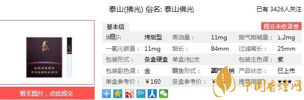 泰山拂光俗稱泰山佛光,自上市以來,以其獨特醉人的“茶甜香”風(fēng)味風(fēng)靡市場,吸收借鑒了其他高端品牌手工制作這一特點,并在泰山拂光這款高端卷煙中深刻體現(xiàn)。被消費者譽(yù)為“近年來最好的高端卷煙之一”。經(jīng)香煙網(wǎng)小編市場調(diào)查泰山拂光售價為160元/包。