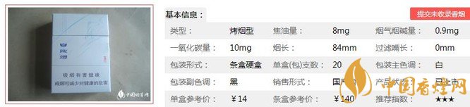 白沙尚品白煙支長84mm,采用國際一流加工設(shè)備進行標(biāo)準(zhǔn)化加工,從煙葉生產(chǎn)到卷煙生產(chǎn)全過程進行化學(xué)成分分析,確保卷煙成品成分平衡。下面我們一起來看白沙尚品白的參數(shù)信息:焦油量:8mg 煙堿量:0.9mg 一氧化碳量:10mg