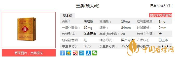 大成玉溪,匯集紅塔人50年造煙智慧和工藝,背負(fù)著500年的歷史使命,開(kāi)創(chuàng)中式卷煙“清香盛世”。大成玉溪,以其八部天香,構(gòu)筑世紀(jì)清香經(jīng)緯;煙支的絲縷之間,都浸透了自然的靈性與科技的精妙。八部天香,以藝術(shù)的節(jié)奏,完成對(duì)清香的詮釋,重新定義中式卷煙清香標(biāo)準(zhǔn)。經(jīng)香煙網(wǎng)小編市場(chǎng)調(diào)查玉溪硬大成售價(jià)為70元/包。