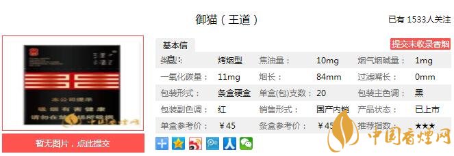 成熟、渾厚、自然的煙草本香結(jié)合甜香韻、果香韻、花香韻和酒香韻,協(xié)調(diào)統(tǒng)一,自然天成。煙香成熟、優(yōu)雅、厚實(shí)、純凈、細(xì)膩、豐富;吃味飽滿、純凈、自然;回味津潤、回甜、舒適、干凈。經(jīng)香煙網(wǎng)小編市場調(diào)查御貓王道售價(jià)為45元/包。