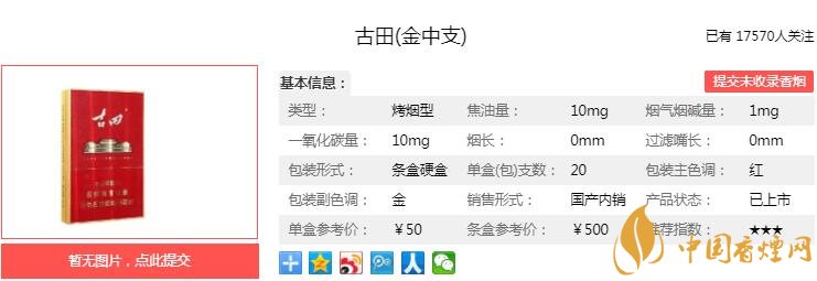 古田金中支煙支長(zhǎng)84mm,過濾嘴長(zhǎng)25mm,定位在中支煙品類。捏一捏煙支,煙絲填充飽滿,切口整齊,仔細(xì)觀察并沒有發(fā)現(xiàn)降焦孔。下面我們一起來看古田金中支的參數(shù)信息:焦油量:10mg 煙堿量:1.0mg 一氧化碳量:10mg